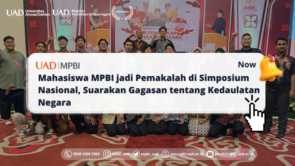 Seorang mahasiswa Magister Pendidikan Bahasa Inggris (MPBI) Universitas Ahmad Dahlan (UAD), Asep Dhani Ghandani, berpartisipasi aktif sebagai pemakalah dalam Simposium Nasional Peringatan Hari Penegakan Kedaulatan Nasional yang diselenggarakan oleh Dinas Kebudayaan (Kundha Kabudayan) Daerah Istimewa Yogyakarta pada 15–17 April 2026 di The Rich Jogja Hotel. Kegiatan ini menjadi wadah bagi generasi muda untuk menyampaikan gagasan kritis terkait isu kedaulatan negara.