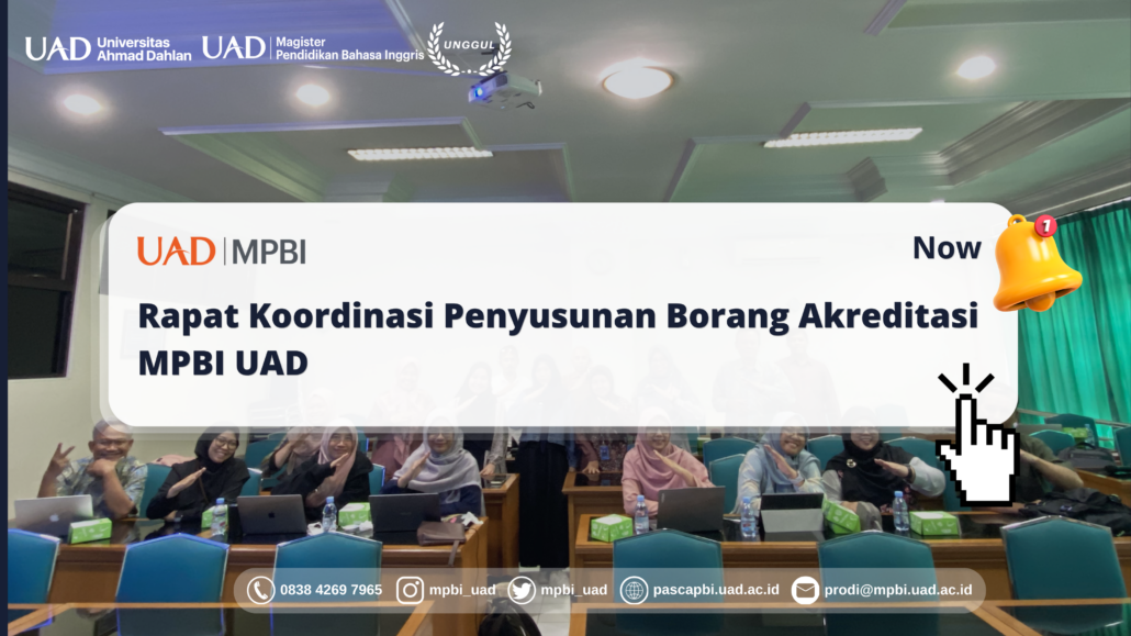Program Studi Magister Pendidikan Bahasa Inggris (MPBI) Universitas Ahmad Dahlan (UAD) mengadakan Rapat Koordinasi Penyusunan Borang Akreditasi pada Selasa, 14 April 2026, pukul 09.00 WIB hingga selesai. Kegiatan ini berlangsung di ruang sidang Kampus 2 UAD dan dihadiri oleh dosen Tim Task Force Akreditasi Prodi MPBI.
